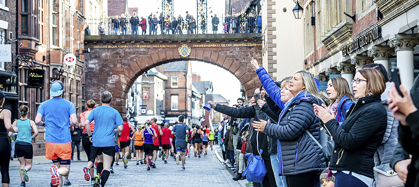 Runners leave the racecourse and head into the City centre passing the Town Hall, Cathedral, split level Middle Ages "Rows", Eastgate Clock, Amphitheatre and through the Roman Walls before heading out of the City across the Old Dee Bridge.