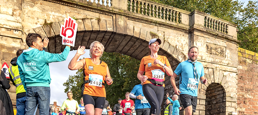 Runners leave the racecourse and head into the City centre passing the Town Hall, Cathedral, split level Middle Ages "Rows", Eastgate Clock, Amphitheatre and through the Roman Walls before heading out of the City across the Old Dee Bridge.